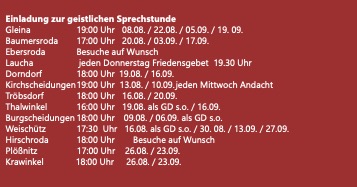 zu den Kurzinformationen finden Sie näheres unter "neue Termine für alle" und im Gemeindeblättchen